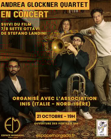 Nous avons le plaisir de vous annoncer un événement exceptionnel : le tout premier concert à l'Espace Morgado, en association avec l’association INIS. Pour cette soirée d’ouverture, nous accueillons la formation Andrea Glockner Quartet, un ensemble de jazz italien. Le concert sera suivi de la projection du film 7/8 Sette Ottavi de Stefano Landini.